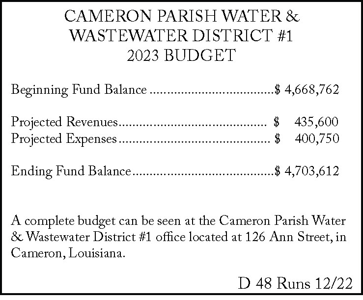 D-48 January 9, 2023 Cameron Pilot Legals 0 Subscribe to the CameronPilot.com and get Unlimited access to all content.