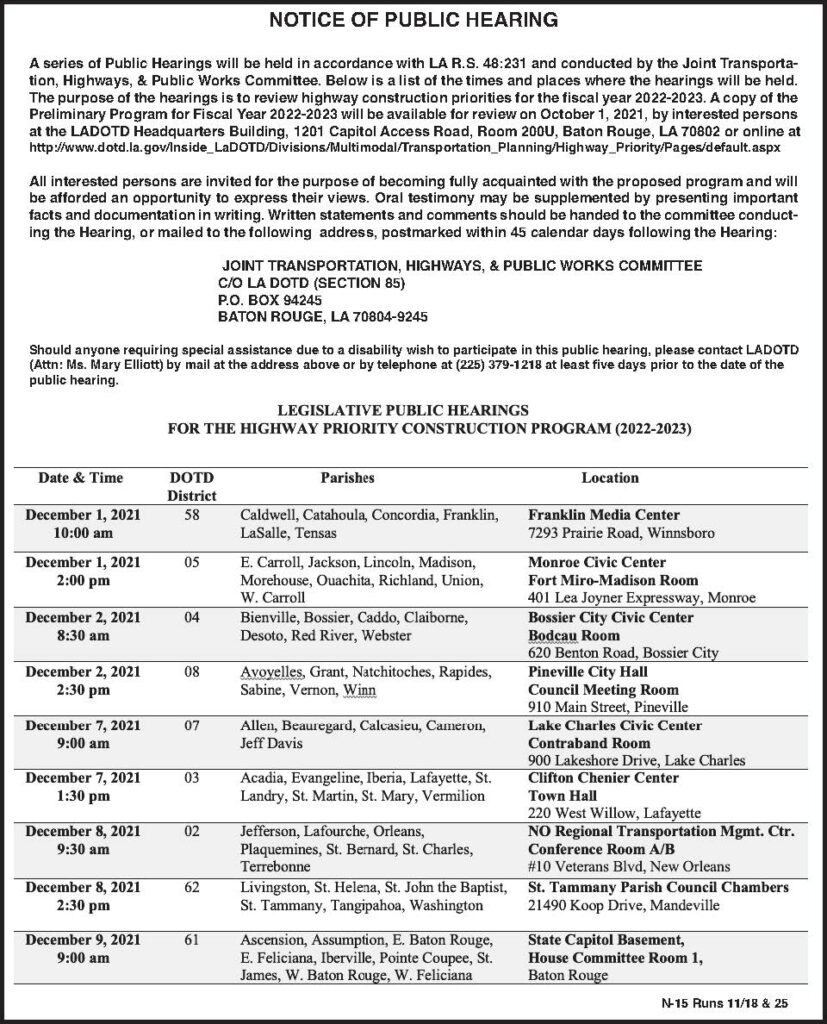 N-15 November 21, 2021 Cameron Pilot Legals 0 Subscribe to the CameronPilot.com and get Unlimited access to all content.